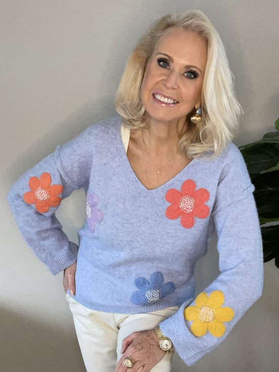 Trui met bloemen – bloementrui – lavendel blauwe trui – trui – trui v hals – one size… | bol